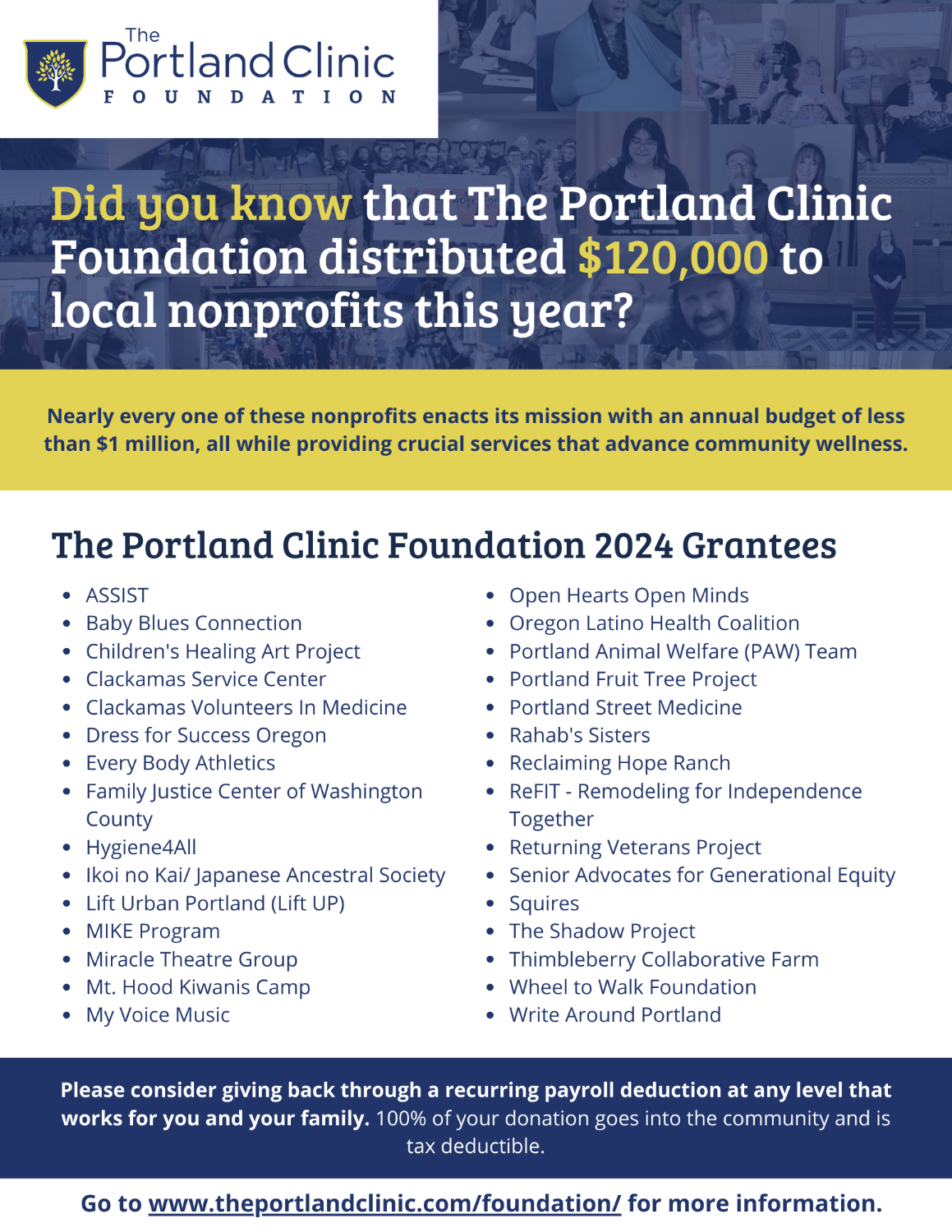 We are an independent 501(c)(3) nonprofit that is funded through individuals like you: friends, family, colleagues, doctors, patients, and community members who want to engage in cutting-edge philanthropy. By combining community contributions with The Portland Clinic Foundation’s rigorously-evaluated grantmaking, we leverage your generosity for maximum benefit to local nonprofits. Our expenses are paid by The Portland Clinic, which means that 100 percent of your contribution goes straight back into our communities.